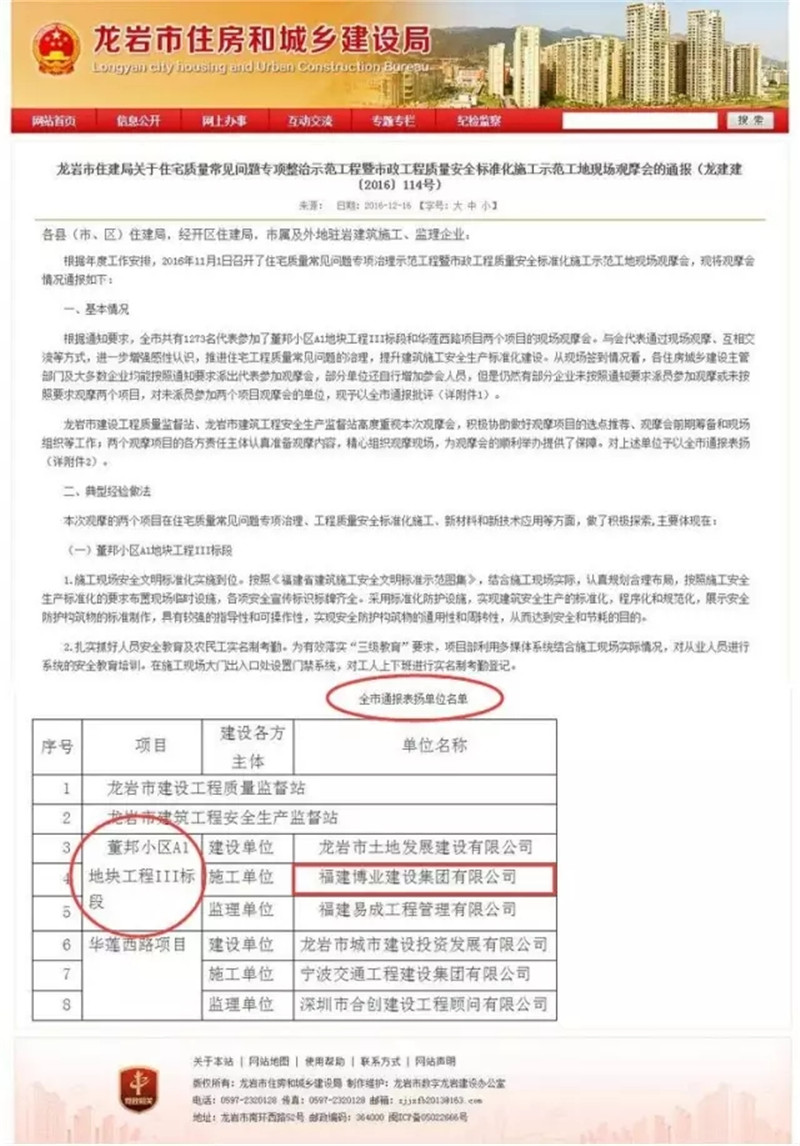 11月1日,由我司承办的“2016住宅质量常见问题专项治理示范工程”现场观摩会在我司承建施工的龙岩董邦小区A1地块工程III标段项目现场顺利举行,观摩现场组织有序,受到了各方的交口赞誉。 12月16日,龙岩市住房和城乡建设局对我司承办的观摩会情况进行了通报,并发布了《关于住宅质量常见问题专项整治示范工程暨市政工程质量安全标准化施工示范工地现场观摩会的通报》(龙建建〔2016〕114号),给予我司全市通报表扬。