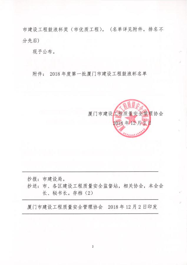 近日,厦门市建设工程质量安全管理协会对申报2018年度第一批厦门市建设工程鼓浪杯奖(市优质工程)的工程,组织了专家核验组现场核验和评审委员会评审。经评审及公示,我司承建的新一代天气雷达建设项目荣获2018年度第一批厦门市建设工程鼓浪杯(市优质工程)金奖。